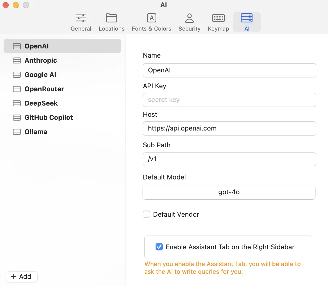 Unlike DataGrip which charges an extra price for its comprehensive AI Assistant features, TablePlus follows a BYOK (Bring Your Own Key) model, allowing you to pick your preferred LLM provider. While it only provides text-to-SQL generation rather than the full suite of AI features offered by DataGrip, this approach gives users more flexibility in choosing their AI backend.